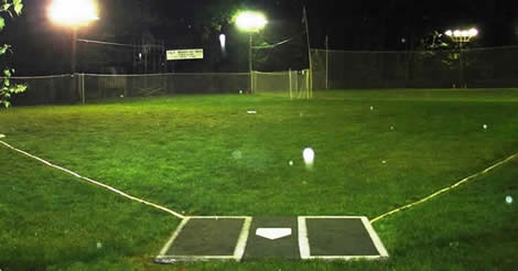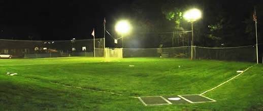 Carroll field is named for Rick Carroll of Carroll Excavating , who graciously donated the dirt and grading necessary to level out this field. By our count nearly 400 tons of dirt were required for this process. This field is a love / hate relationship. Some teams love it, some hate it. The green monster in left field is a mere 85' away, but it is a full 14' tall. The right field fence is even closer - only 72' down the line but it is even taller - 12' of actual fence sitting on a 4' tall hill. Center field is the longest of any field being 110' in length and 8' in height. Against a good short stop, there are almost no hits to be had to left field here. Singles can be had to right, especially off the fence and singles up the middle are readily available also. The problem come when there is already a man on 1st base. Grounders to the 1st base side and up the middle result in more double plays than all other fields combined. Runners on 1st and 2nd and a ground ball to short results in automatic double play when the fielder steps on 3rd just a step or two away and relays to the mound for a pitcher's hand put out. This field shrinks with each additional base runner. The only way to score serious runs here is to hit HRs. For some reason, even with the short fences, this has proven difficult for many teams. Both foul poles for this field are 25' tall with American flags gracing their tops. Carroll field yields an average of 16 runs per game, with a spot on league wide average of 8 HRs per contest. Many of the league's most shocking upsets have occurred here and the field requires a team of patience and opportunity to tame it and claim it as their own. One thing is true about this field, rarely are there mercy rule games and contests invariably go down to the wire. As for improvements, Carroll Field has undergone a major lighting upgrade since the end of the 2011 season. Halogen lights on each of the 1st and 3rd base lines have been replaced with 400 watt metal halide lights. The lights on the 2 poles located behind the green monster have been replaced with 2-1,000 watt metal halides and 2-400 watt metal halide lights. This bank of 4 lights is mounted on a 40' pole. The 8 original halogen lights consumed nearly 56 amps and provided 260,000 lumens of light. The new lights consume 20 amps and provide 420,000 lumens of light, bringing the total illumination on the field to 500,000 lumens. All that remains in this process to be done is to run wire underground to the pole. For fencing, the fishnet utilized in center and right fields has been be fronted by 6' high windscreen. Some day we would like to widen this field an additional 8' down the 3rd base line. Our estimate is that it will take 220 tons of dirt to accomplish. This would make base hits considerably easier to come by on this field and make it not so HR centric. J & M Field (driveway) Return to Top