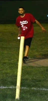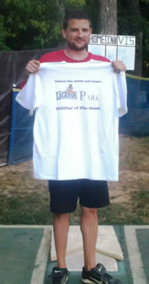 The final series of the week featured PVB against the league leading UMH on CC field. PVB was the visiting team and began the game in fast fashion, lighting up the score board for 5 runs on HRs by Gabe and Brent. UMH responded with 1 in the bottom of the 1st and after holding PVB scoreless in the 2nd, tacked on 3 more on an Andy Russell HR. AFter PVB got back in the game with 4 runs in the 3rd, UMH exploded for 17 total runs in the next 2 innings to break open a close game eventually winning 21-11 with Dave Page picking up the win on the mound. For the game Andy Russell crushed 4 HRs while Blake Lansing added 3. Dave, Brandon and Brent all hit 2 HRs for PVB. Game 2 was all UMH from the start as they got out to an early 5-0 lead and tacked on 15 more in the next 2 innings, desposing of PVB by the mercy rule 20-5 after 4 innings. For the game UMH used a balanced attack as Blake, Eric and Andy all hit 2 HRs with John Bruce adding his 1st HR of the evening. For PVB Brett Fisher made his 1st appearance of the year, crushing 2 HRs in the losing effort. John Bruce picked up the win on the mound. Game 3 was a much closer affair as PVB fell behind 6-0 but roared back with 7 runs in the top of the 4th to take the lead 10-6. Some poor fielding and a timely HR by Andy put UMH back in the lead 11-10 after 4. UMH claimed the win with a 4 run 5th. Dave page drove UMH to victory hitting 4 HRs in the game with Andy adding 3 more. Brandon led PVB with 3 9 HRs and 20 RBIs. Lead off man Blake Lansing added 5 HRs and 11 RBIs while Dave Page added 5 and 12. John Bruce contributed 2 HRs and 7 RBIs. Brandon Kennedy led PVB with 5 HRs and 9 RBIs, Dave, Brett and Gabe Fisher all hit 3 HRs and brother Brent added 2 more. Upset Award of the Week Return to Top The surprise upset of the week was an entire series, as 2 very equally matched teams - the U and the Dirt Dogs squared off in the battle of last place teams. The Dirt Dogs' bats came to life to claim a series sweep against the struggling U, and in turn move the Dirt Dogs into a tie for 3rd place in the Contenders division - just a single game back of PVB. To the credit of the U, even though they did not play particularly well at the plate, they hung in there and kept swatting away - and obviously had a good time in spite of the circumstances. They will get things worked out and my prediction is it will be against one of the best teams in the league - as they have "gotten well" against us several times in the last couple years. Congratulations to the Dirt Dogs for getting off the porch and running with the big dogs - now all they have to do is keep up the pace. Series of the Week Return to Top Our 1st Series of the week paired two surprising teams, both vying for league lead in the Contenders Division. The 4-2 Redlegs versus the 3-3 Knights. The Redlegs win the award for making the most of what you have, and the Knights with the additions of Corey White and Josh Wonderleigh, paired with dramatically improved play by Amos Jones and Dustin Weaver have the 2011 last place Knights in contention for a 2012 division crown. The Knights won the flip and elected home team. Inning 1 was an omen of what was in store for the Knights as Blake Rinehart crushed 2 HRs in inning 1 and Kyle Urigh and newbie Adam McGuire both added a solo shots. Corey White countered with a solo shot in the bottom of 1 to narrow the gap to 5-1 Redlegs. Adam homered again in the 2nd and the Knights could not get going and were blanked for the frame, heading into the 3rd down 8-1. After a scoreless top the Knights did manage to put 2 runs up in the bottom of the 3rd on solo shots by Corey and Josh and the score stood at 8-3 after 3. Adam added another solo shot in the 4th for the Reds and the Knights went to work in the bottom half by adding 4 runs on solo shots by Amos and Corey. Adam added his 4th HR in the top of the 5th and the Reds carried a 9-7 lead into the bottom of the 5th. Amos led off the inning with a solo HR to close within 1 and after a double by Josh, Blake stabbed a line drive by Corey to right for out 1, but Josh tagged to 3rd to move the tying run just 45' from pay dirt. Pitcher Travis Rinehart enticed Dustin Weaver to ground right back to pitcher's mound bringing up leadoff man Amos Jones with 2 down and the tying run in Josh still on 3rd and a potential walk off HR for Amos. Travis nibbled around the corners and managed to get a looking strike and a foul ball strike on Amos. With a 4-2 count Travis made a perfect pitch and struck Amos out swinging to preserve the 9-8 victory for the Redlegs in game 1. The Knights started quickly in game 2, pushing 3 across as Amos crushed a bb to left center for a 2 run shot and small ball added another run. The Redlegs began their turn in identical fashion to game 1, with Blake crushing 2 HRs in the 1st off of Knights starter Corey and Adam and Travis adding solo shots for a total of 5 runs in the 1st. The Knights responded with 2 more in the top of the 2nd courtesy of a another 2 run bb by Amos to left center. Inning 3 was good to the Redlegs as Blake crushed a 2 run HR and Adam added a 3 run shot for 5 in the inning. The Knights were unable to reciprocate in the bottom of the inning and trailed 10-5 into the 4th. The Reds power surge continued in the bottom of the 4th as Blake, Adam and Travis hit back-to-back-to-back solo HRs in the frame to drive their lead to 13-5 heading into the 5th. The Knights were able to add a single run on a Dustin Weaver bomb, but fell to the Redlegs 13-8 as Travis Rinehart picked up the victory. Blake and Adam both contributed 3 HRs in the effort while Travis found his stroke and added 2 of his own. Kyle was a setup man in the effort delivering only 1 HR but leading the team with 5 runs scored. For the Knights Amos led all hitters with 2 Hrs with Dustin added one. Game 3 presented the last opportunity for the home Knights to avoid a sweep and they reversed the trend of the until the 3rd when Josh and Dustin again 